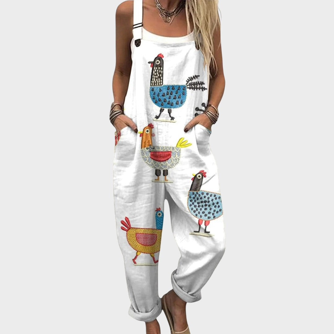 Ta ohlapen kombinezon združuje udobje in edinstven dizajn v kos oblačila, ki ga boste oboževali nositi vsak dan. S širokim krojem, praktičnimi žepi in živahnimi detajli je popoln za sprehode, izlete ali sproščene trenutke doma.