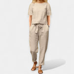 Osvežite svojo poletno garderobo s tem elegantnim in udobnim dvoslojnim kompletom, idealnim za vroče dni in sveže večere. Sestavljen iz lahkotne bluze in širokih hlač z vrvico, ponuja udobje in stil za vsako priložnost.