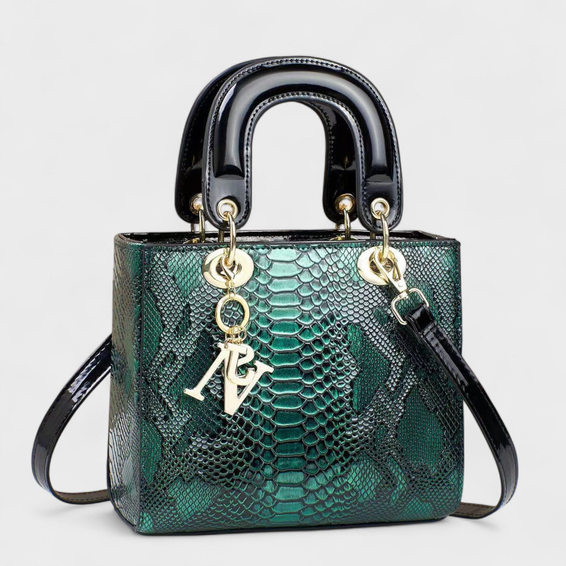 Odkrijte torbo, ki je definicija rafiniranosti, z živalsko teksturo in visokosijajnimi kovinskimi deli. Njena strukturirana zasnova vključuje dva ročaja in dolgo odstranljivo naramnico, kar omogoča vsestranskost od formalnih dogodkov do sproščenih trenutkov.