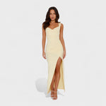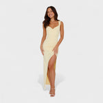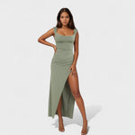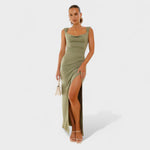 Obleka Constança redefinira sofisticiranost s svojim drapiranim dekoltejem in odprtim hrbtom z mašnjo. Njena ozka silhueta podaljšuje postavo, medtem ko stranski razporek omogoča svobodo gibanja. Idealna je za posebne dogodke, kjer želite zasjati.
