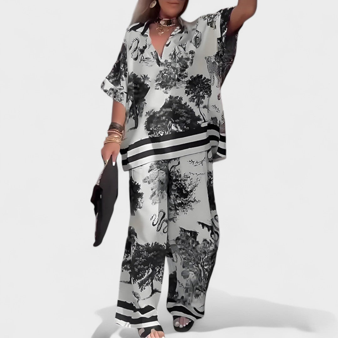 Sprostite svoj slog z zaupanjem s kompletom Dainora – popolno definicijo sodobne sofisticiranosti. Ta eleganten in sproščen komplet združuje drzen vzorec in prosti kroj, kar vam omogoča impresiven videz brez žrtvovanja udobja.