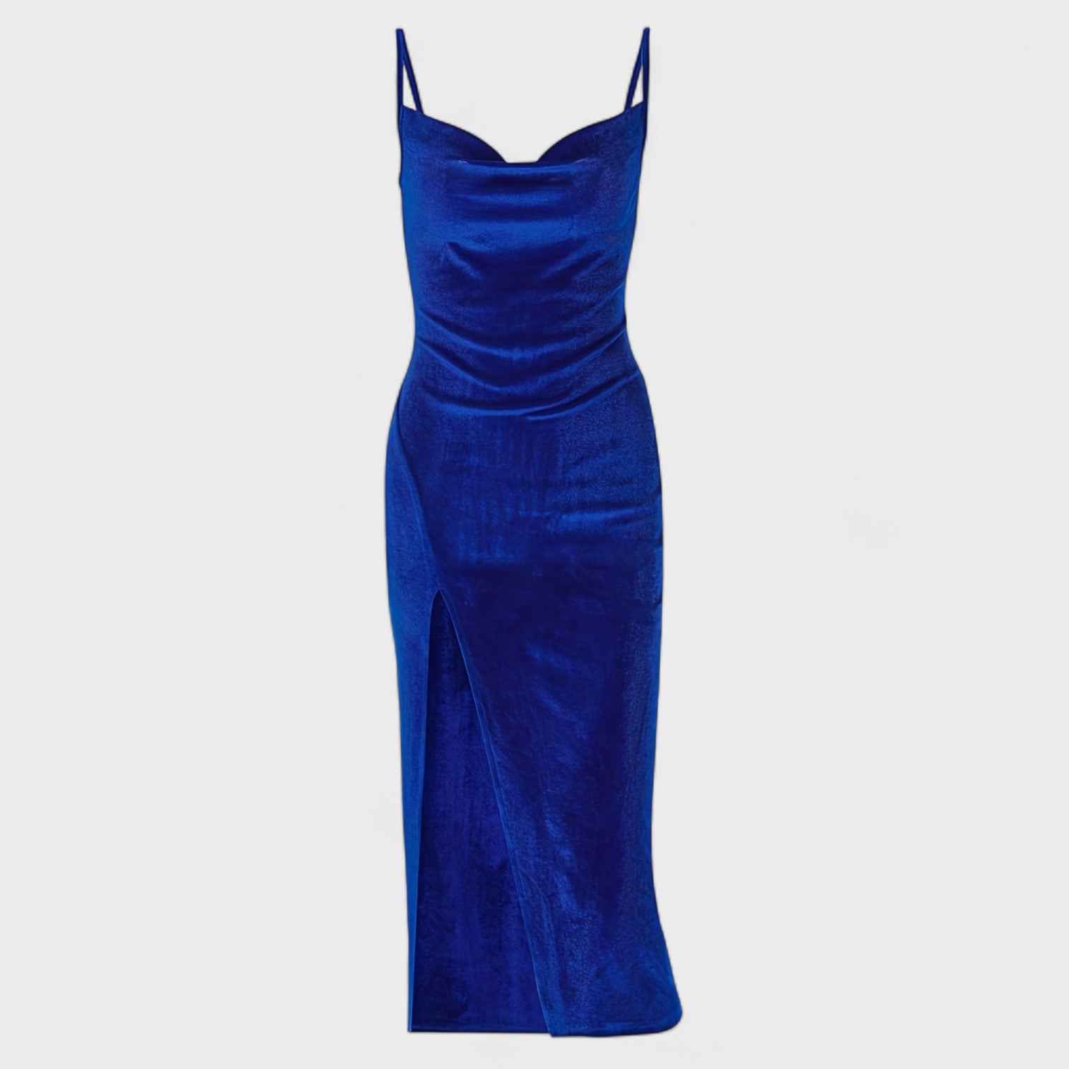 Odkrijte obleko Gabriela, ki združuje senzualnost in izstopajočnost v vsakem ovinku. Njen mehak žamet in subtilno drapiran dekolte vas bosta očarala, medtem ko bočni razporek doda pravo mero drznosti.