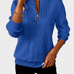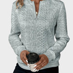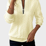 Ta ženski pulover z zadrgo in pletenjem združuje toploto z moderno modo, kar ga naredi za nujno stvar v vaši sproščeni garderobi. Narejen iz mehkega in trpežnega materiala, ponuja sproščen kroj, ki zagotavlja, da izgledate šik, medtem ko ostajate topli.