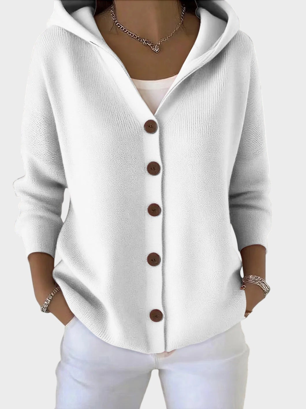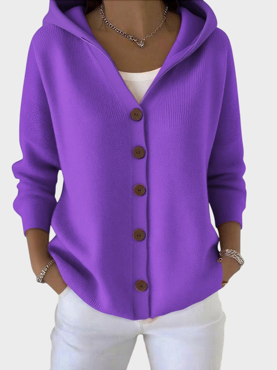 Pletena jakna Zora je izdelana iz mehkega pletenega materiala, ki greje, ne da bi bil težak. Njena ohlapna kroj omogoča enostavno nošenje čez majico ali bluzo, medtem ko kapuca daje prijeten kokonski učinek – popolno za hladnejše trenutke.